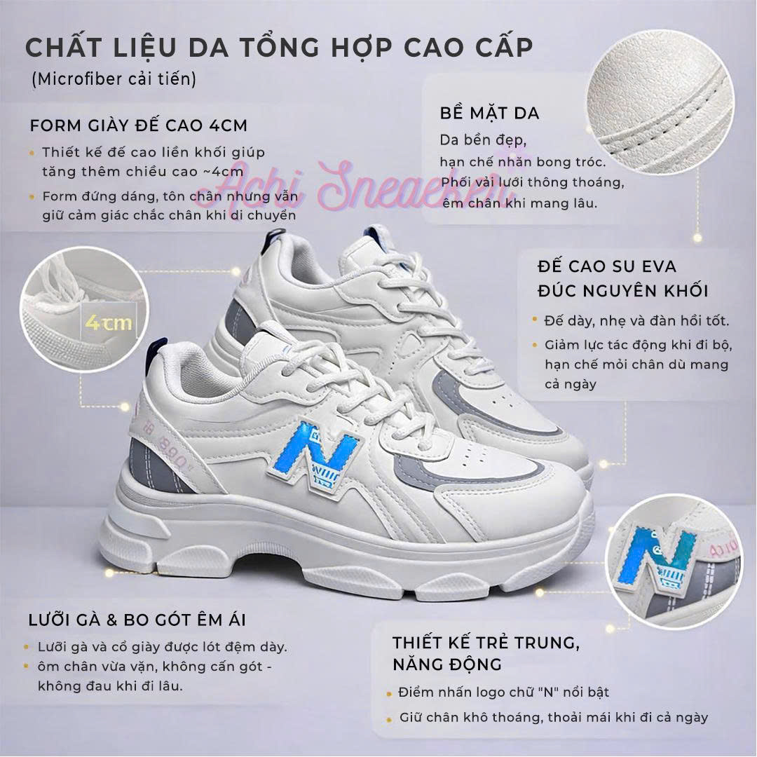 Giày Sneaker Nữ Tăng Chiều Cao 4cm logo N – Giày Thể Thao Nữ Hack Dáng, Độn Đế Form Dày, Nhẹ Êm, Dễ Phối